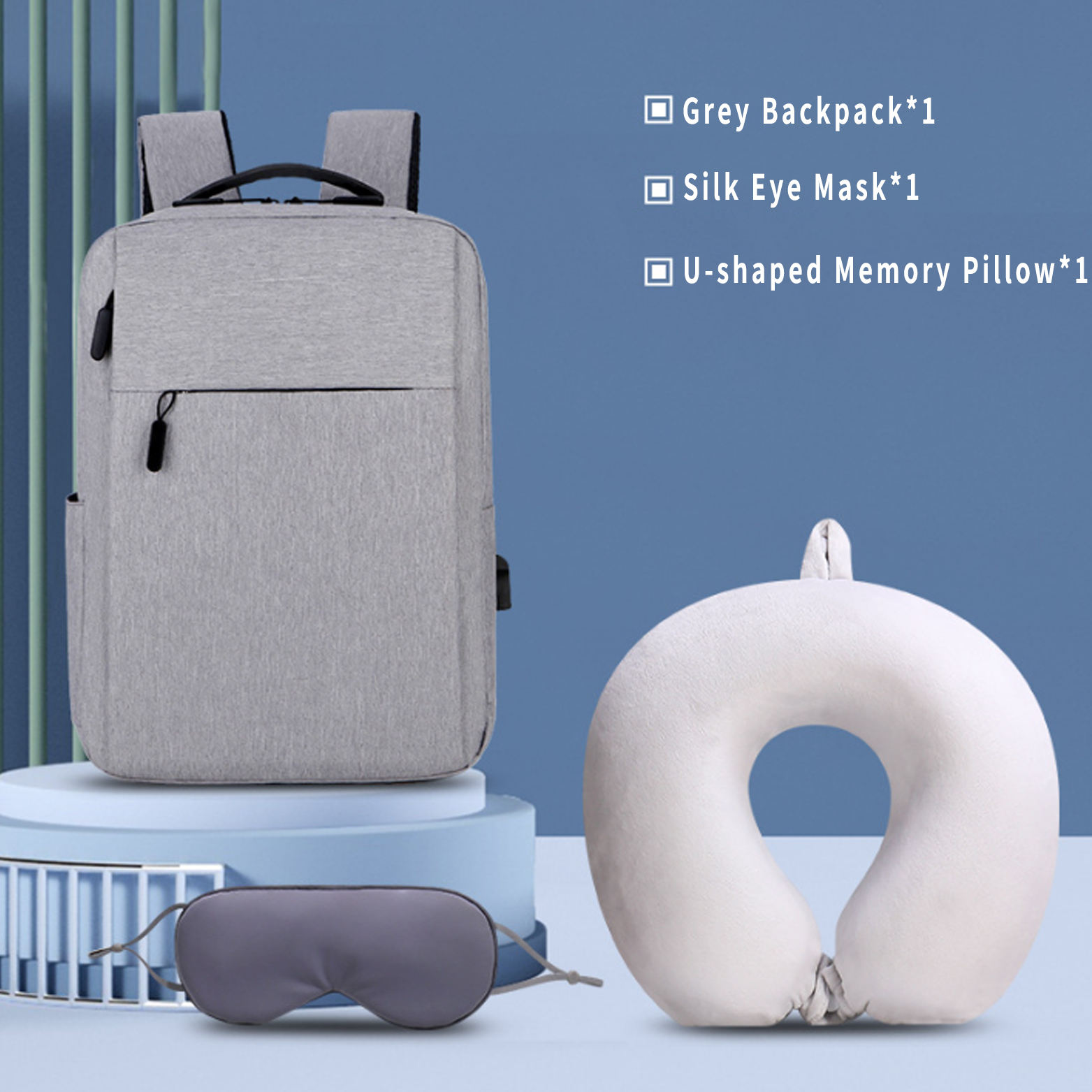 This practical Backpack Set is ideal for corporate travel kits, employee gifts, or commuter swag. Includes a sleek black backpack with water-resistant fabric and multiple compartments, plus a travel comfort bundle: a soft U-shaped neck pillow and a light-blocking eye mask. Durable, organized, and designed for daily use. Each item features a clean logo imprint area—perfect for branding. A versatile, ready-to-customize bundle suited for companies, travel agencies, and events.