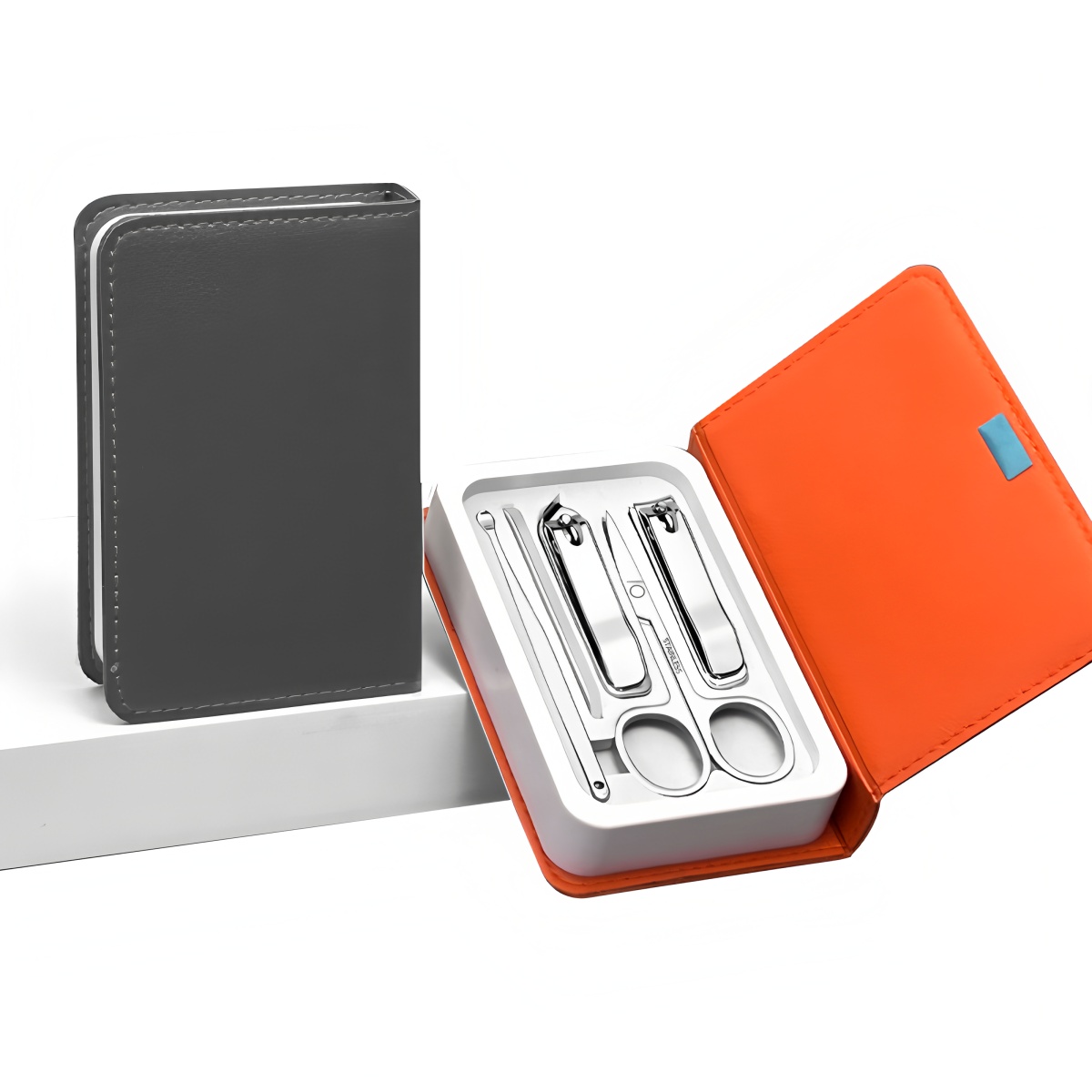 This 5-piece Nail Clipper Set is a versatile addition to promotional product lines, ideal for corporate gifting, client appreciation kits, or retail stock. The set includes two precision clippers (for fingernails/toenails), curved scissors (for trimmer care), a cuticle pusher (gentle nail maintenance), and a slanted tweezer (for detail work)—all organized in a sleek, leatherette case (available in black/orange, with a logo-ready surface).Crafted from rust-resistant stainless steel (durable for daily use) and packaged in a compact, travel-friendly case (fits easily in bags/purses), it suits all demographics. A practical, low-cost option for businesses, banks, or event swag—functional, long-lasting, and universally useful.