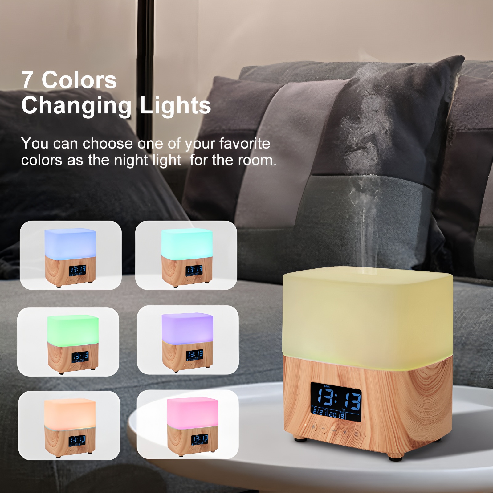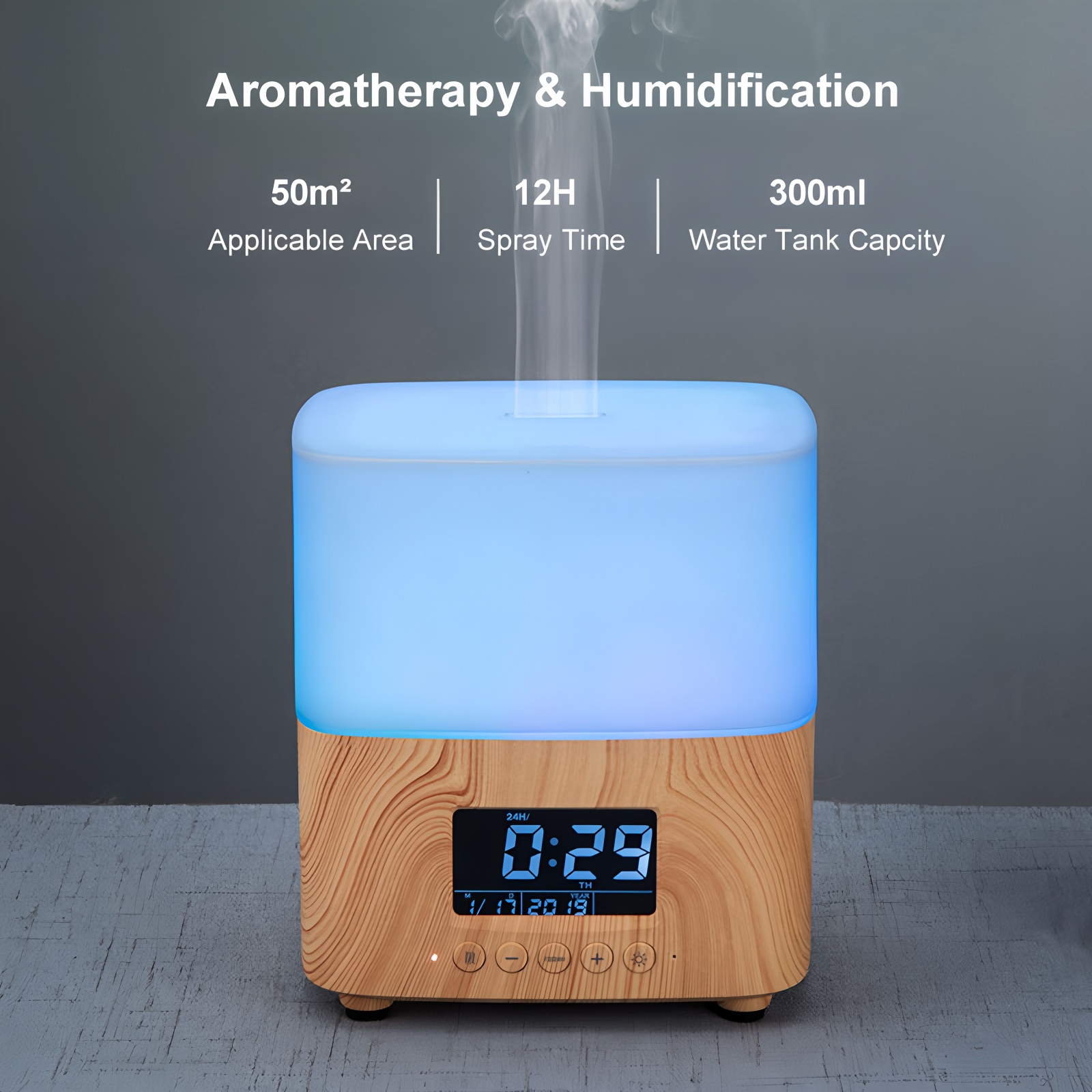 All-in-One Clock Aroma Diffuser with Night Light – a versatile promotional product for U.S. distributors. Combines digital clock, ultrasonic diffuser, adjustable night light, and humidifier in a compact design. Quiet operation, BPA-free materials, and smooth surface for custom logo branding. Ideal for corporate gifts, wellness programs, hotel amenities, and events. A practical, high-value choice for clients seeking functionality and brand visibility.
