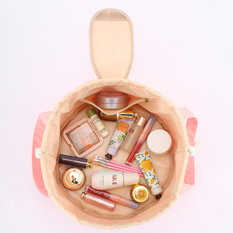 The customizable cosmetic bag features a Velcro front cover closure and double drawstrings for quick and secure fastening. Its barrel-like structure keeps items from sliding out during packing. The bag easily fits travel-sized toiletries such as lotions, creams, facial cleansers, foundations, eye shadows, powders, blushes, lipsticks, makeup brushes, and more. Lightweight and compact, it’s perfect for travel.