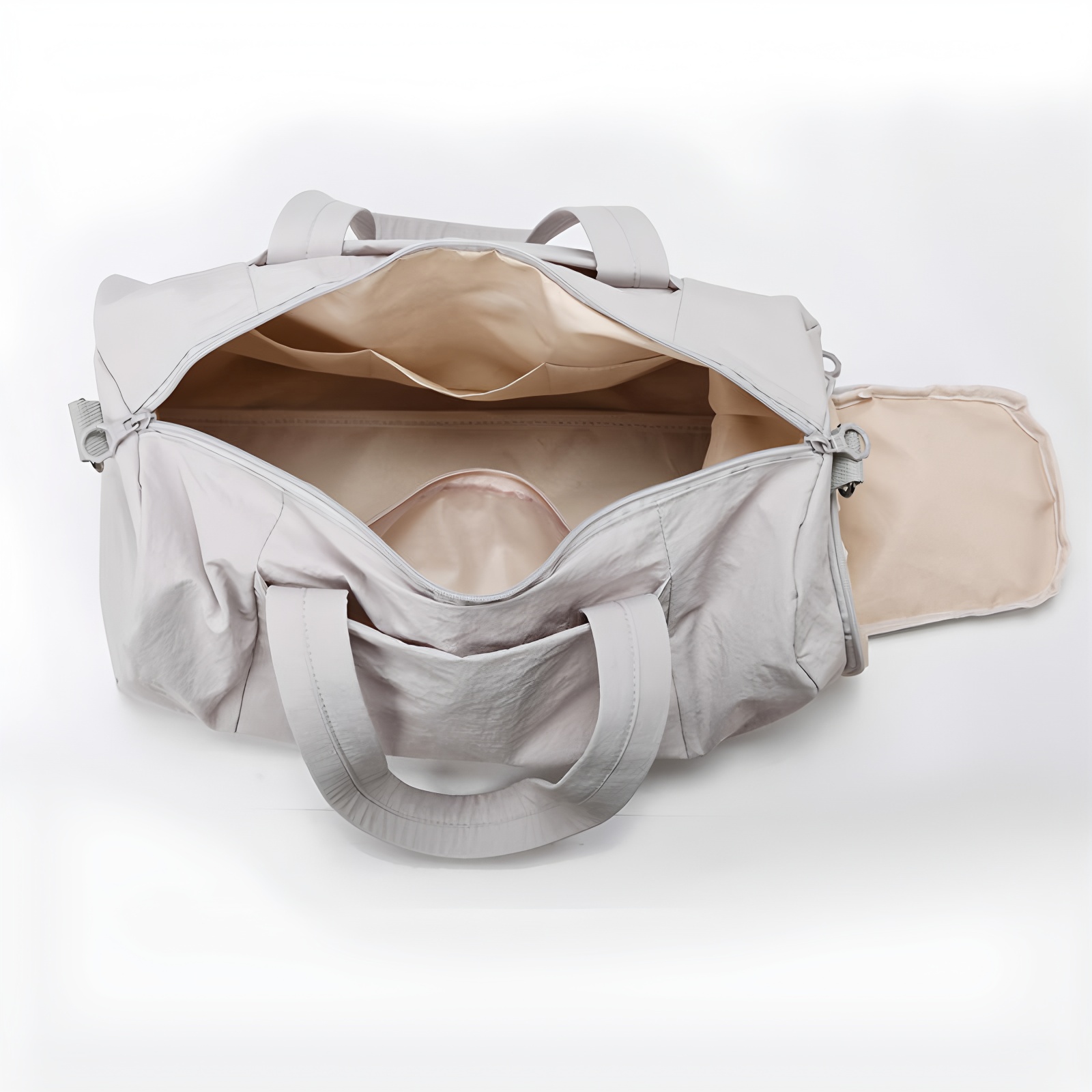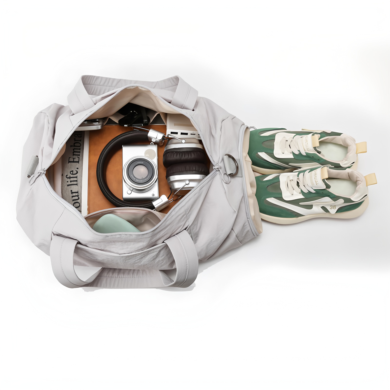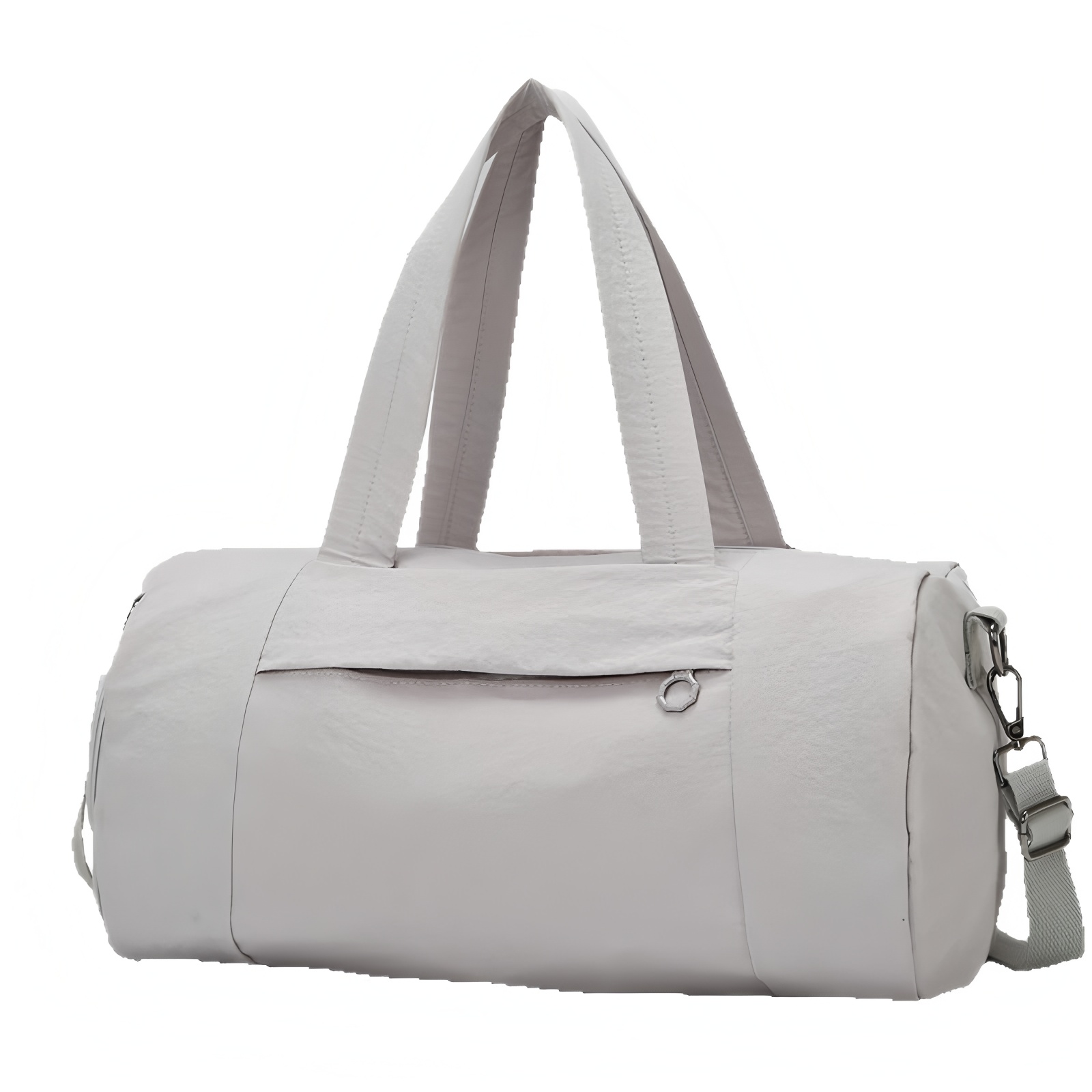 Lightweight gym duffel for corporate wellness, sports & travel giveaways. Water-resistant nylon with spacious main compartment, separate shoe section, padded handles & adjustable strap. Ideal for custom logo printing on smooth front panel. Available in multiple colors: Raspberry Pink, Caramel Brown, Light Blue, Gray, Beige, Black. Perfect for trade shows, employee incentives & bulk orders.