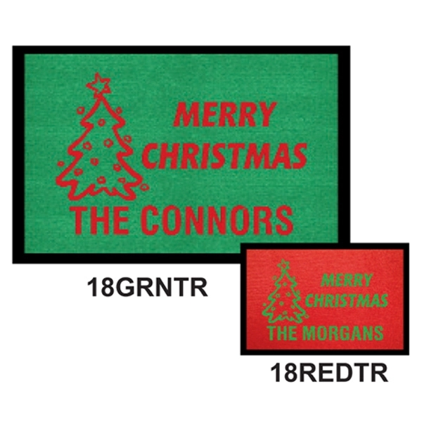 Merry Christmas logo floor mat, 18" x 27". Perfect for the Holiday gift giving season. Olefin carpet is extremely durable and very easy to maintain. Logo mats are imprinted with nylon flock fibers, embedded into carpet.