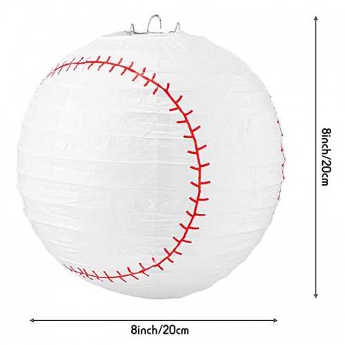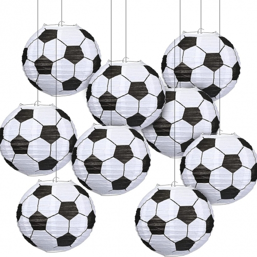 The lantern ' s body is crafted from paper and features the classic hexagonal pattern of a football, with black and white patches alternating. Its spherical shape takes up the center of the frame, creating a straightforward composition.This suspended paper lantern is perfect for use at party events. You can also entrust us to print your exclusive logo or emblem on it.