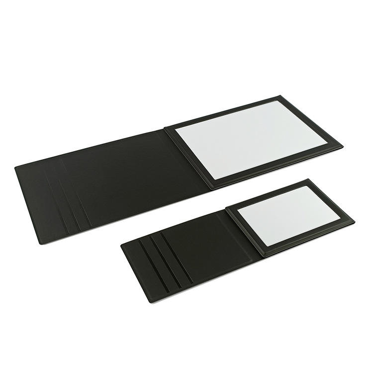 The folding mirror is crafted from PU and glass, featuring a foldable design that makes it perfect for travel, holidays, cars, boats, caravans, camping, and more. Its compact size fits effortlessly into pockets, purses, or travel bags. Additionally, we offer complete customization options for the logo, allowing you to tailor it to your unique branding requirements.